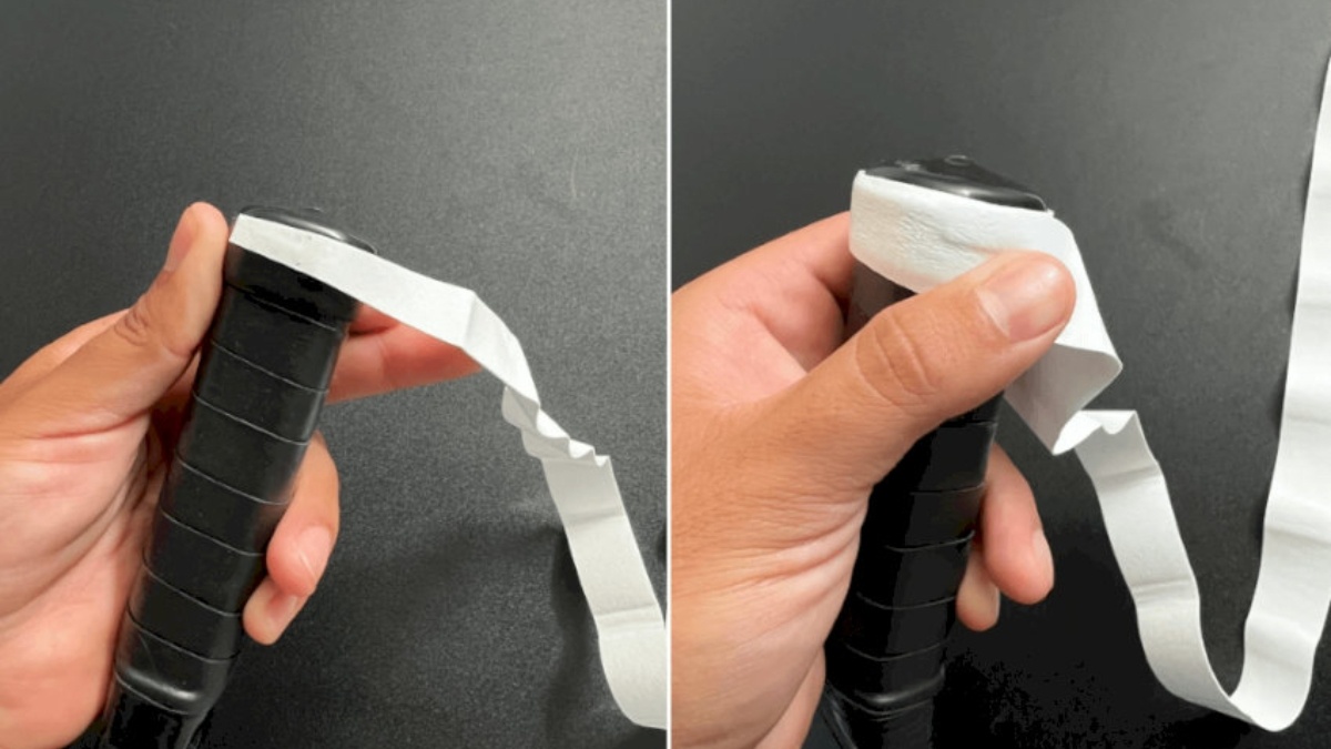 Quấn một vòng dưới cùng: Tiến hành cuốn một vòng băng quấn theo các cạnh dưới cùng của cán cầm để đảm bảo băng quấn được cố định và không bị lỏng. Lưu ý quấn đều tay để băng quấn không bị gập hoặc nhăn.