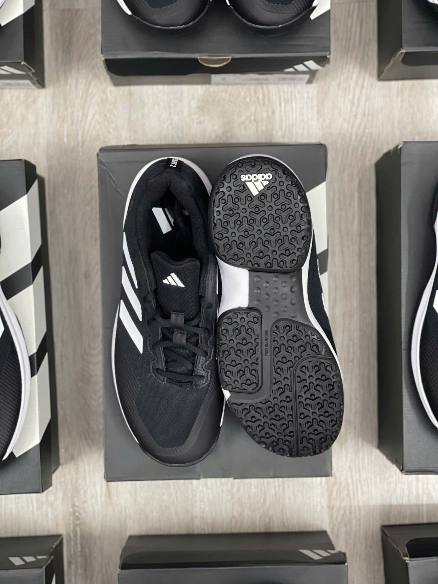 Đế ngoài bằng cao su Adiwear bền bỉ, cho độ bám tốt trên các mặt sân cứng và sân đa năng. Cấu trúc đế giúp tăng sự ổn định, hỗ trợ người chơi tự tin trong các pha di chuyển ngang và dừng đột ngột.