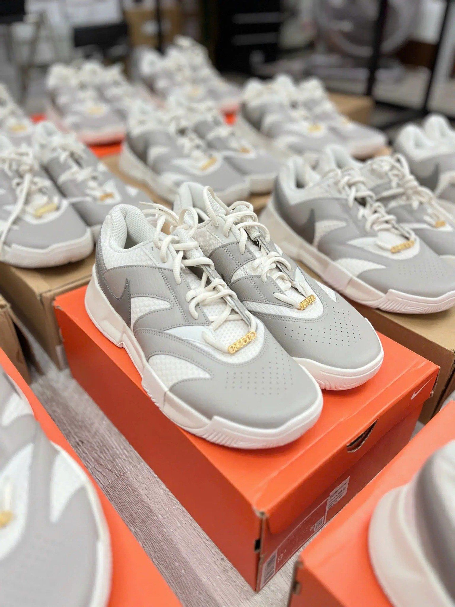NikeCourt Lite 4 Premium ‘Gold Flair Pack’ (mã FZ1220-001) là mẫu giày được thiết kế cho các môn thể thao trên sân cứng như tennis và pickleball. Sản phẩm thuộc bộ sưu tập “Gold Flair Pack” với phối màu xám nhạt kết hợp chi tiết ánh kim màu vàng và bạc, mang lại vẻ ngoài sang trọng nhưng vẫn thể thao. Phần thân giày làm từ lưới kỹ thuật kết hợp da tổng hợp, giúp tăng độ bền và khả năng thoáng khí trong suốt quá trình vận động.