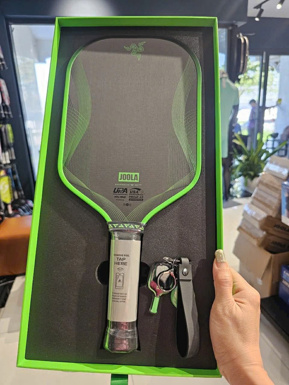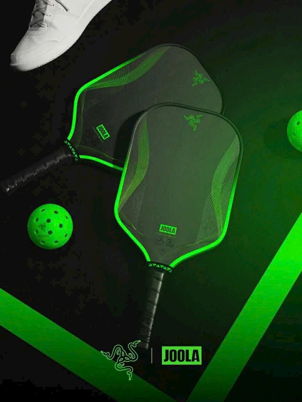 Chiếc vợt mang thiết kế đặc trưng của Razer với logo rắn ba đầu và màu xanh neon, kết hợp công nghệ vợt cao cấp của JOOLA. Đây cũng là lần đầu hai lĩnh vực game và pickleball giao thoa trong một sản phẩm thể thao hiệu suất cao.